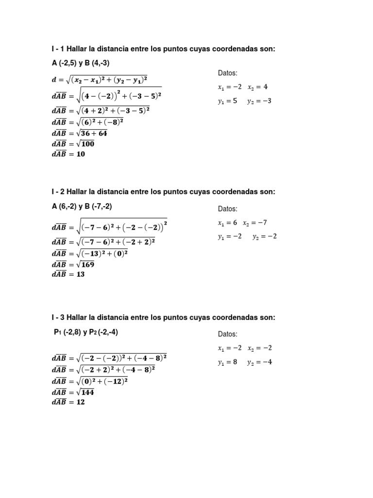 I - 1 Hallar la distancia entre los puntos cuyas coordenadas son: