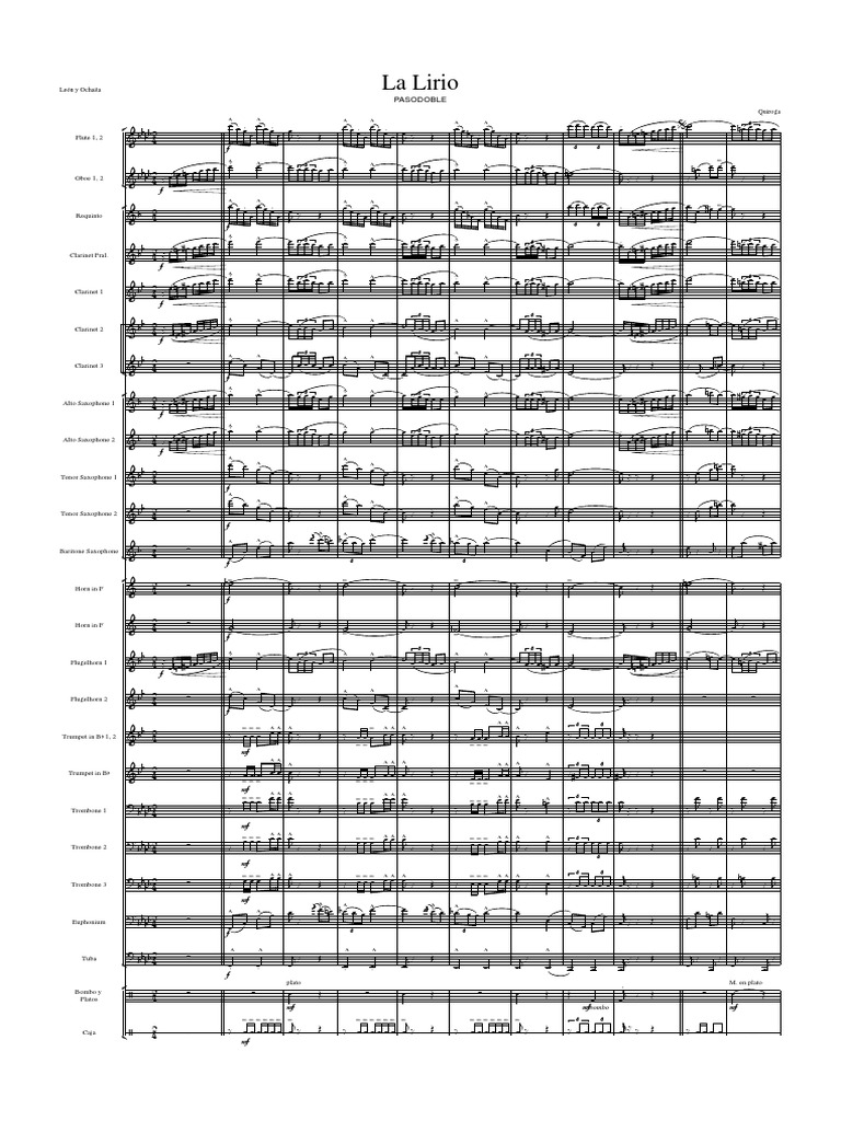 Este documento contiene la partitura musical de una pieza llamada 'La Lirio'. La partitura incluye las partes para varios instrumentos como flauta, oboe, clarinete, saxofón, trompeta y trombón.