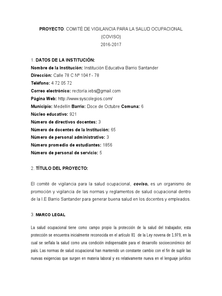 PROYECTO: COMIT DE VIGILANCIA PARA LA SALUD OCUPACIONAL