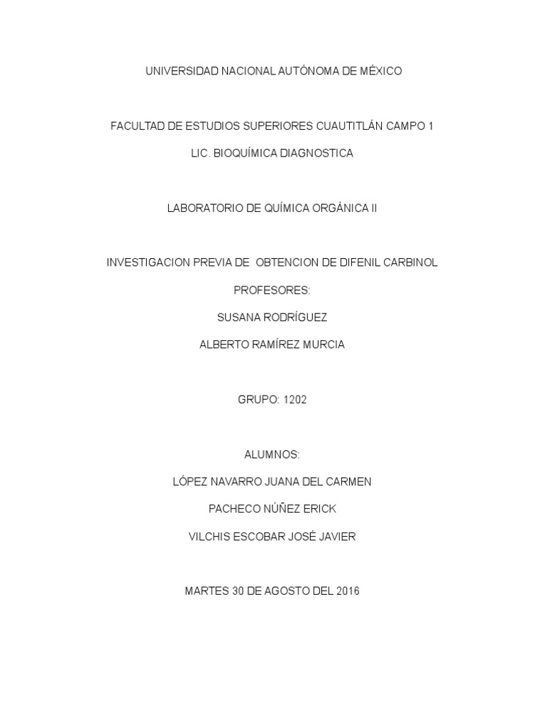 INVESTIGACION PREVIA DE OBTENCION DE DIFENIL CARBINOL