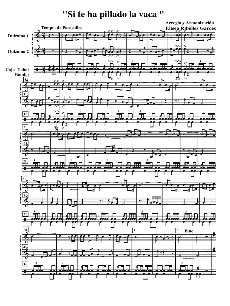 Este documento contiene la partitura musical para una pieza titulada "Si te ha pillado la vaca". Incluye las partes para dulzainas, caja, bombo y otros instrumentos típicos de la música tradicional valenciana. La partitura proporciona las notas musicales, ritmos y indicaciones para cada instrumento a lo largo de la pieza.