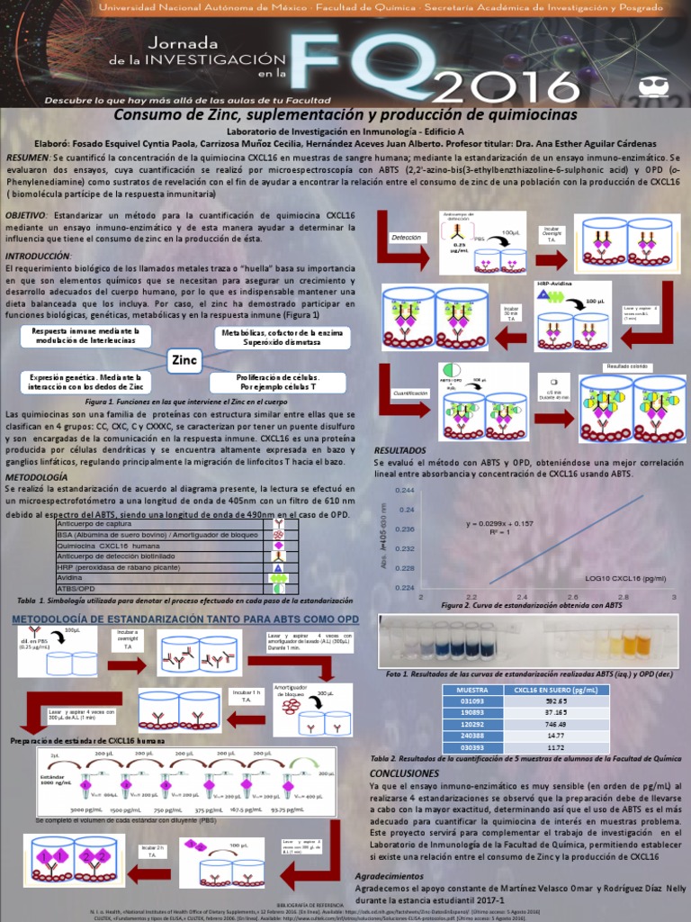 evaluaron dos ensayos, cuya cuantificacin se realiz por microespectroscopa con ABTS (2,2'-azino-bis(3-ethylbenzthiazoline-6-sulphonic acid) y OPD (oPhenylenediamine) como sustratos de revelacin con el fin de ayudar a encontrar la relacin entre el consumo de zinc de una poblacin con la produccin de CXCL16