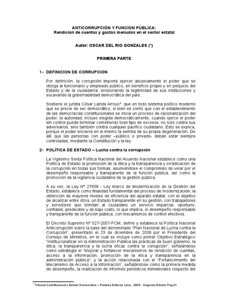 No se trata de una lista para determinar el perfil ideal del emplead público. de no asumir riesgos funcionales para corregir corruptelas. 15. moral (19). concientizando de empleado a empleado. que por cierto es duro. de decir si a todo aun cuando no asista la verdad real y legal. Pero es un imperativo decirla. imparcial. entre otras. por más dura que esta sea. sin excepción. fortalecerse los mecanismos de acceso a la información y rendición de cuentas. genera responsabilidad administrativa. están para servir al Estado y no para servirse de él con ventajas y leguleyadas.IMPACTO DE LAS CORRUPTELAS MENUDAS 18 19 Ley Nº 28175 – Ley Marco del Empleo Público . a la superioridad y a la función pública. como decía el extinto Genaro Matute. son obligaciones legales establecidas como principios de observancia obligatoria e ineludible por parte de los funcionarios públicos previstos en nuestro disperso y desintegrado ordenamiento legal administrativo. a costa de cualquier decisión. No.ACTOS QUE LINDAN CON LA INTREPIDEZ ADMINISTRATIVA Debo decir que en la gestión pública no se trata de decir no a todo.legal. Estos comportamientos.Art. que están escritos pero que se incumplen permanentemente. 8º . equitativo. 16. producto de la experiencia ni tampoco conductas que se propongan como adecuadas para todo aquel que ejerce una actividad o función pública. Tampoco se trata de actos de valentía. que linde con la intrepidez e ignorancia. en la razón y en el bien general. de una estancia cómoda en el aparato estatal. se encuentran contenidos en abundantes dispositivos legales. 17. Debe reforzarse la promoción y ejecución de actividades en materia anticorrupción. y promoverse la vigilancia ciudadana en el Sector Público. expresados en principios. No se trata tampoco de pasarla inadvertido en la función estatal. porque eso es entorpecer la gestión estatal. IV Ley Nº 27867 – Gobiernos Regionales Art. penal y civil. adoptando un silencio cómplice y demostrando falta de valentía para decir la verdad funcional. pues todo aquel que ejerce función estatal. cuyo quebrantamiento. la que a veces no se quiere ni gusta ser escuchada. ladrillo a ladrillo”. desde la Comisión de Alto Nivel que integró. integrador. competitivo. pero que es mas satisfactorio sucumbir con honor y con la satisfacción del deber cumplido. previsor ( 18). como tampoco. ex Contralor de la República. Hay la necesidad de adoptar acciones administrativas e implementar mecanismos de transparencia y difusión de la información pública. de persona a persona. deberes y prohibiciones.CRUZADA CONTRA LA CORRUPCIÓN Entonces. en su terca y silenciosa lucha contra la corrupción. se debe construir una “pared anticorrupción. moderno imparcial. atacar la “corrupción hormiga” o “corrupción al menudeo” en todos los niveles de la Administración Estatal. por respeto y dignidad a si mismo. entonces se debe emprender una cruzada pública contra la corrupción. ético. sino fundamentar la negativa en la ley. actuando responsablemente y de acuerdo a los principios que impone el servicio civil. racional. pues esta ardua e incomprendida lucha es tarea y responsabilidad de todos. por el temor a perder el empleo. inclusivo.