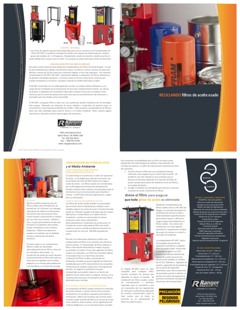 Descubra nuestra lnea de alta calidad de Compactadores de Filtros de Aceite Ranger, la cual