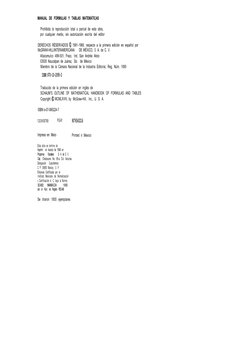 MANUAL DE FORMULAS | Y TABLAS MATEMATICAS Murray R. Spiegel Trataremas elementales como algebra, geometria, | trigonometria, geometria analitica y calculo. i Cantiene un conjunto de formulas y tablas mateméticas de gran utlidad practic, Incluye definiciones, teoremas, graficas y diagramas para la correcta comprensién y aplicacién de las formulas. aMANUAL DE FORMULAS Y TABLAS MATEMATICAS 2 400 FORMULAS Y 60 TABLAS MURRAY R. SPIEGEL, Ph. D. Profesor de Mateméticas det Rensselaer Polytechnic Znstitute ‘TRADUCCION Y ADAPTACION nua GUERRERO RIEERO Qvinico de Universidad de Alesha McGRAW-HILL MEXICO, BUENOS AIRES . CARACAS . GUATEMALA LISBOA. MADRID» NUEVA YORK + PANAMA . SAN JUAN ‘SANTAFE DE BOGOTA . SANTIAGO . SAO PAULO AUCKLAN » HAMBURGO . LONDRES « MILAN . MONTREAL NUEVA DELHI . PARIS . SAN FRANCISCO. SINGAPUR vous «"SIUNEY. TOKIO » TOROWTOMANUAL DE FORMULAS Y TABLAS MATEMATICAS Prahibiga la reproduccién total o parcial de asta obra, por cualquier medio, sin autorizacién seria del editor DERECHOS RESERVADOS © 1981-1968, respacto a la primera edicién en espanol por McGRAW-HILLINTERANERICANA DE MEXICO, § 'A.'de CV. ‘Allacomulea 499-501, Frace, Ind. San Andrés Aloo 153500 Naucalpan de Juarez Eide México Miombro de la Cémara Nacional de la Industia Eelloral, Reg. Nim. 1880 SBN: 970-10-2085-2 Traducido do la primera edicién on inglés do SCHAUM'S OUTLINE. OF MATHEMATICAL HANDBOOK OF FORMULAS AND TABLES Copyright © MCMLXVIIL by MeGraw-Hl, Ine., U. 8. A. ISON 0-07-060224-7, zosese7e9 PEST sovesaszis Impreso en Mixes Printed in Mexico fata ca emia wee ae neo Peper" Bante 8 Ase Dregscen Castine eraser ‘soe mana 8 Gr Nino fopee RCO Se tiraron 1800 ejemplaresPROLOGO El objelo de este manual es el de presentar un conjunto de firmulas y tablas matematicas que seguramente serin de valot para los estudiantes ¢ investigadores en materias como. as ‘matemiticas, fisica, ingenieria y otras. Para cumplir este proposito, se ha tenido el euidado de escoger equellas formulas y tablas’ que puedan ser de mayor ullidad practica prescindien- do de las fOrmulas altamente especializadas que raramente se emplean. No se ha ahorrado esfuerzo para presentar los datos y formulas en forma precisa a la vez. ‘que concisa para que se puedan encontrar con la mayor confianca y facilidad, Los temas tratados oscilan desde los elementales hasta los avanzados. Enire los temas le- rmentales figuran el dlgebra, Ie geometia, la trigonometria, le geometia analiica y el cileul, Entre los temas avanzados, figuran las ecuaciones diferenciales, el anilisis vectorial, las series de Fourier, las funciones gamma y beta, las funciones de Bessel y de Legendre, las transfor- rmadas de Fourier y de Laplace, las funciones clipticas y algunas otras funciones. especiales importantes. Este amplio contenido de temas ha sido acogido con el fin de poder proporcionar, fen un solo volumen, la mayor parte de los datos matematicos importantes de utilidad para el cestudiante 0 investigador, cualquiera que sea su dea particular de interés 0 su nivel de apren- dina Este libro esté dividido en dos partes principales. En la parte 1 estin contenides las fir- ‘malas matemiticas al tiempo que se tratan otros asunios tales como. definiciones, teoremas, agrificas diagramas, ete, que son esenciales para la correcta comprensién y aplicacién de las frmulas. En esta primera parte figuran ademés amplias tablas de integrales y_transformadas de Laplace que pueden ser de gran valor para el estudiante o investigador. La parte I contiene lablas uméricas tales como los valores de las funciones clementaes (tigonoméiricas, logarit- ‘micas, exponenciales, hiperbélicas, etc.) asi como también de las funciones de carder avanza- do (de Bessel, de Legendre, elipticas, ete.): Las tablas numéricas correspondientes a cada fun- cen se presentan por separada con el objeto de evitar confusiones, especialmente pare el prin- cipiante en matemsticas. Asi por ejemplo, las funciones seno y coseno para ingulos en grados ¥y minutos se presenlan en tablas separadas mis bien que en una sola tabla, lo cual evila al fesudiante el tener que preocuparse acerea de la posibilidad de incurrir en algiin error por no buscar ea Ia columaa © fla apropiadas Deseo expresar’ mis agradecimientos a los diversos autores y editores por haberme otorgado cl permiso de tomar datos de sus libros pare emplearios en varias de las tablas de este manual. Las referencias apropiadas aparecen junto con las tablas comrespondientes. Me hallo especial~ ‘mente agradecido del redactor, del exiinto Sir Ronald A. Fisher, F. RS. del Dr. Frank Yates, FR. S, y de Oliver and Boyd Ltd, Fdimburgo, por el permiso para emplear datos de la ta bla TIL de su libro Statistical Tables for Biological, Agricultural and Medical Research. Deseo ademis expresar mi gratitud a Nicola Monti, Henry Hayden y Jack Margolin por ‘su magnifica cooperacién editorial. M. R. SPIEGELTABLA DE MATERIAS Parte Constantes notables Productos y factores notables 2 3, Formula del binomio de Newton y coeficientes binomiales 4, Formulas geométricas Punciones trigonométricas & Nameros complejos 7. Funciones exponenciales y logaritmicas Funciones hiperbslicas, Soluciones de las ecuaciones algebraicas Formulas de geometria analitica plana 11. Curvas planas notables 12, Férmulas de geometria analitica del espacio 13, Derivadas 14, Integrales indefinidas 45, Integrales definidas 16, La funcion Gamma 101 17, La funcién Beta 103 18. Ecuaciones diferenciales bisicas y sus soluciones o 1, Series de constantes 0 20. Series de Taylor Q 21. Néimeros de Bemoulli y de Euler 22. Férmulas de andlisis vectorial 23. Series de Fourier 3 2, Fanciones de Bessel 136 25. Fanciones de Legendre 146 26. Funciones asociadas de Legendre ag 27. Polinomios de Hermite tsa 28. Polinomios de Laguerre u 29. Polinomios asociados de Laguerre 55 30. Polinomios de Chebyshev 187 31, Fun dns. hipergeometricas 16032, Transformadas de Laplace 33, Transfor