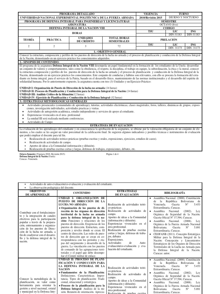 El programa de la asignatura Defensa Integral de la Nacin VIII desempea un papel fundamental en la formacin de los estudiantes de la Unefa: desarrollar