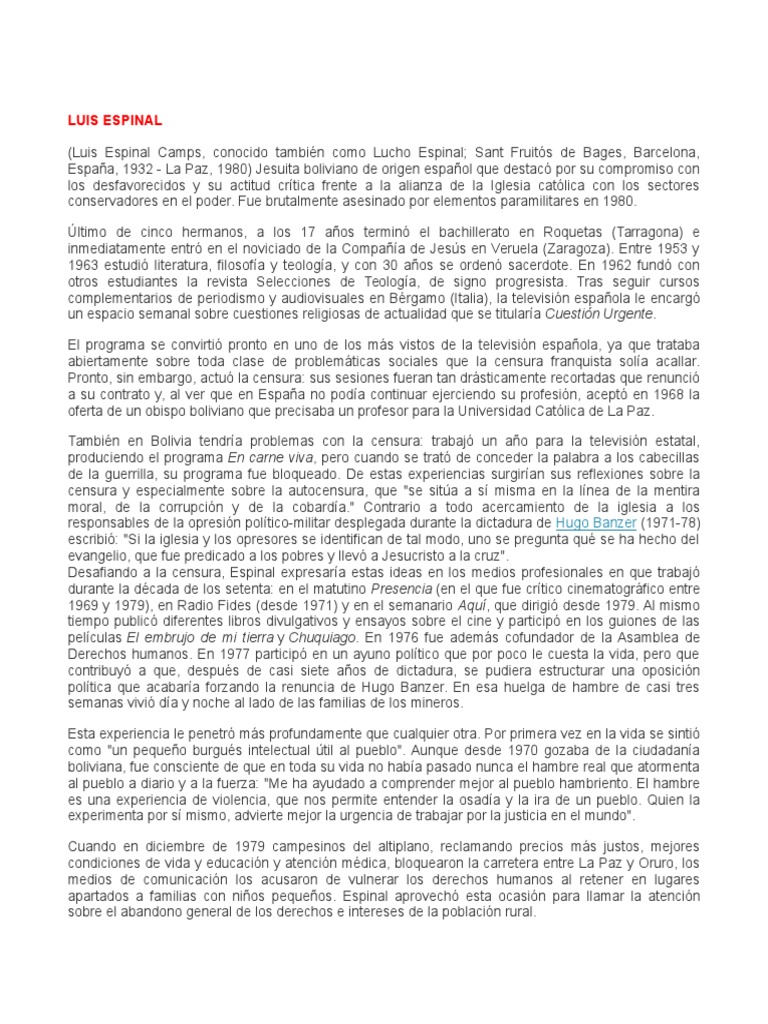 Espaa, 1932 - La Paz, 1980) Jesuita boliviano de origen espaol que destac por su compromiso con