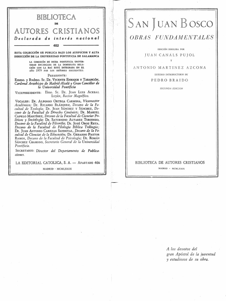 Edición dirigida por Juan Canals Pujol y Antonio Martínez Azcona, y estudio preliminar de Pietro Braido, catedrático de la Universidad Pontificia Salesiana de Roma. Contiene las principales producciones literarias de este gran apóstol de los jóvenes que fue Don Bosco (San Juan Bosco) y que permiten entender su vida, su estilo educativo y sus instituciones. Conforma un corpus está integrado por: cinco biografías, ocho escritos pedagógicos y siete bloques de documentos que caracterizan su actividad de fundador. La bibliografía citada muestra el estado actual de los estudios sobre Don Bosco y como contribución para quienes aspiren a ulteriores profundizaciones personales, sobre la ejemplaridad de un santo eminentemente activo y que sin embargo nos ha dejado un centenar de títulos. Quien quiera conocerlos en su totalidad podrá acudir a consultar la edición anastática en 37 volúmenes.