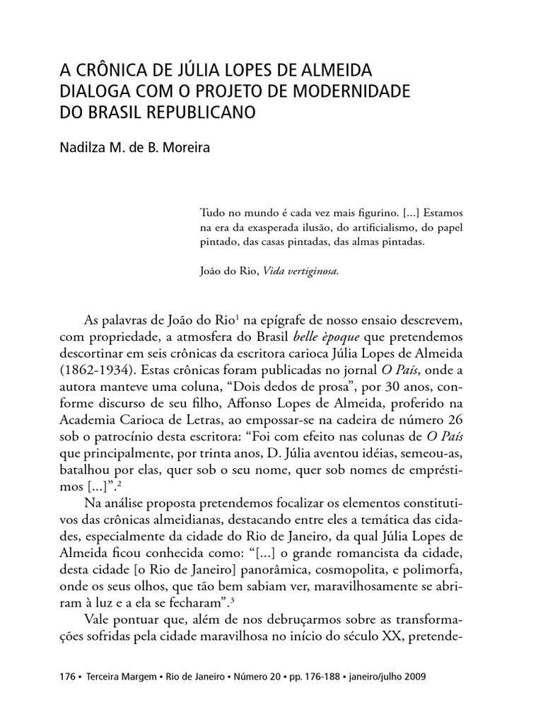 As palavras de João do Rio 1 na epígrafe de nosso ensaio descrevem, com propriedade, a atmosfera do Brasil belle èpoque que pretendemos descortinar em seis crônicas da escritora carioca Júlia Lopes de Almeida (1862-1934). Estas crônicas foram publicadas no jornal O País, onde a autora manteve uma coluna, “Dois dedos de prosa”, por 30 anos, con- forme discurso de seu filho, Affonso Lopes de Almeida, proferido na Academia Carioca de Letras, ao empossar-se na cadeira de número 26 sob o patrocínio desta escritora: “Foi com efeito nas colunas de O País que principalmente, por trinta anos, D. Júlia aventou idéias, semeou-as, batalhou por elas, quer sob o seu nome, quer sob nomes de emprésti- mos [ Na análise proposta pretendemos focalizar os elementos constituti- vos das crônicas almeidianas, destacando entre eles a temática das cida- des, especialmente da cidade do Rio de Janeiro, da qual Júlia Lopes de