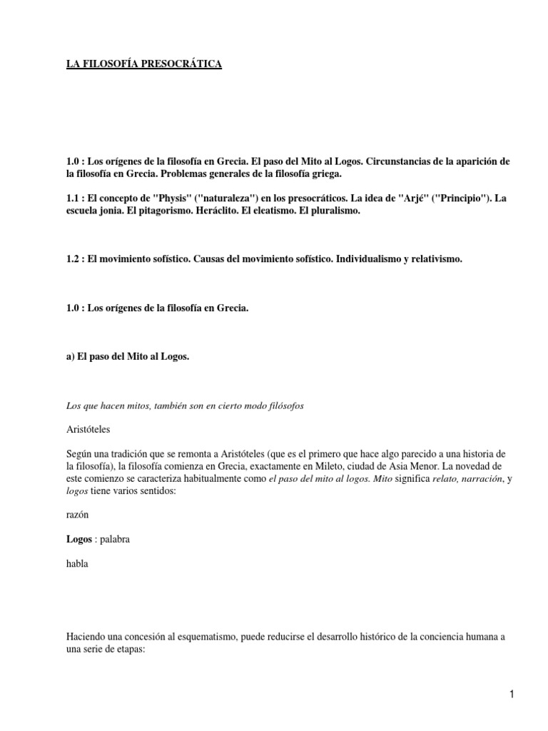 1.0 : Los orgenes de la filosofa en Grecia. El paso del Mito al Logos. Circunstancias de la aparicin de