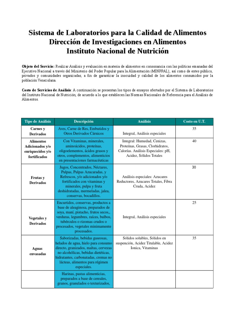 Costo de Servicios de Anlisis: A continuacin se presentan los tipos de ensayos ofertados por el Sistema de Laboratorios