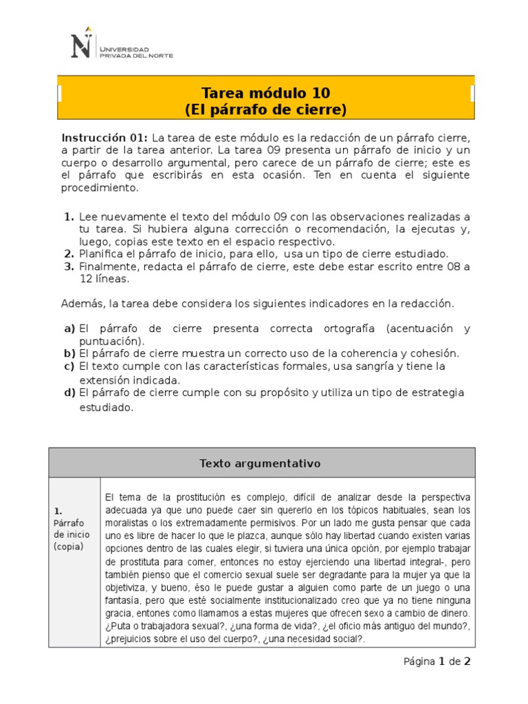 Instruccin 01: La tarea de este mdulo es la redaccin de un prrafo cierre,