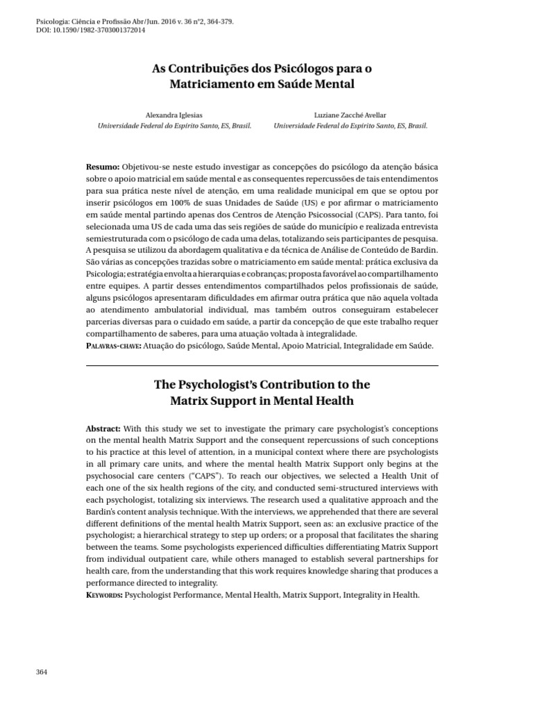 How to cite: Iglesias, A., & Avellar, L. Z. (2016). The psychologists contribution to the matrix support in mental