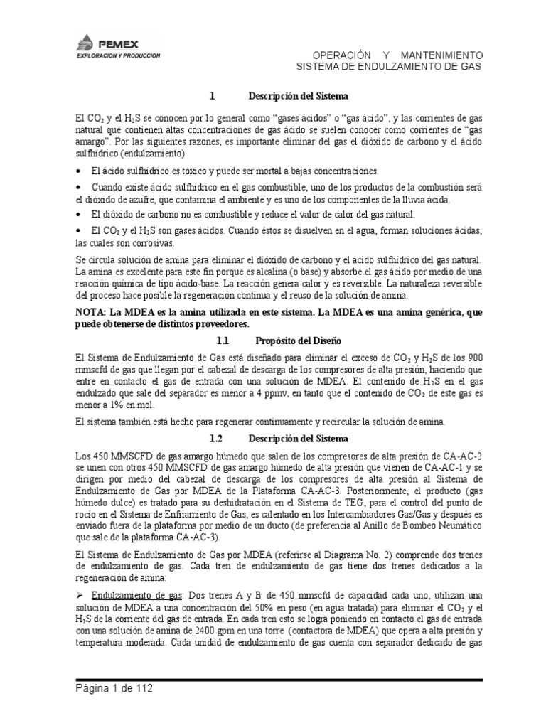 El Sistema de Endulzamiento de Gas est diseado para eliminar el exceso de CO 2 y H2S de los 900