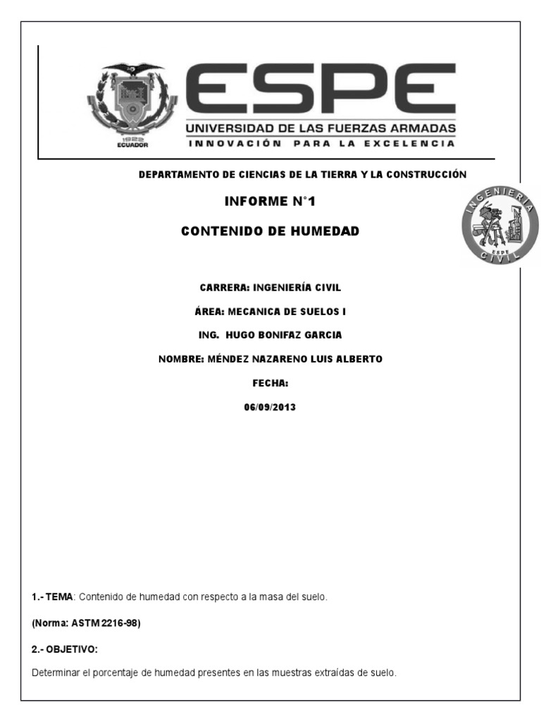 Ecuador, Escuela Politcnica del Ejrcito. Mecnica de Suelos 1, Informe Espe-Sangolqu, Ing. Hugo