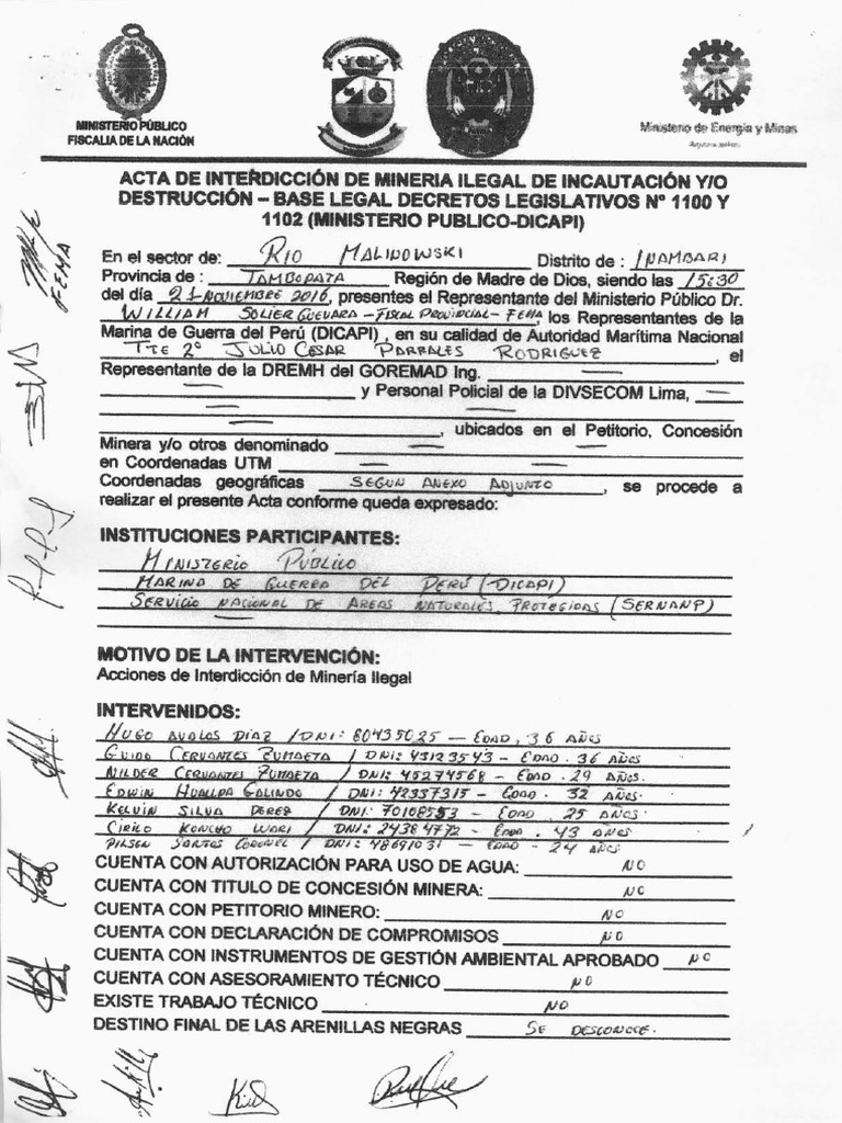 Como parte de los operativos que vienen realizándose en Madre de Dios para erradicar a los mineros ilegales de la Reserva Nacional Tambopata, la Dicapi (Dirección General de Capitanías y Guardacostas), la Fiscalía Especializada en Materia Ambiental (FEMA) y el Sernanp (Servicio Nacional de Áreas Naturales Protegidas por el Estado) realizaron el lunes 21 de noviembre un operativo en el río Malinowski y detuvieron a 7 personas que se encontraban realizando trabajos de minería ilegal dentro de la reserva.