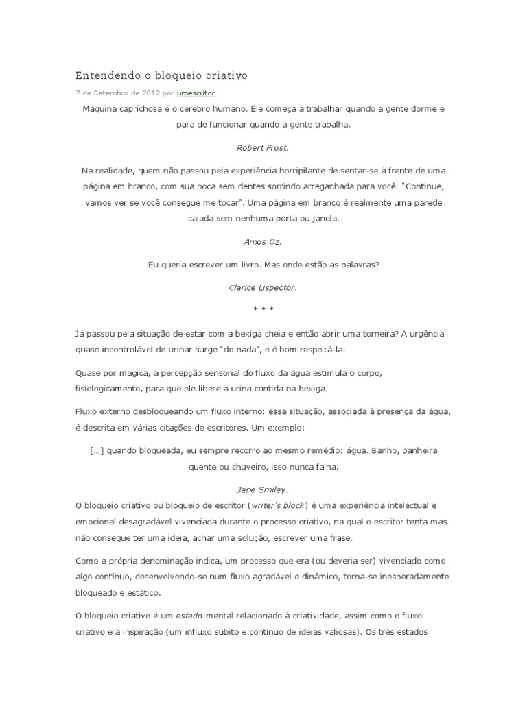 O bloqueio criativo ou bloqueio de escritor (writers block) uma experincia intelectual e