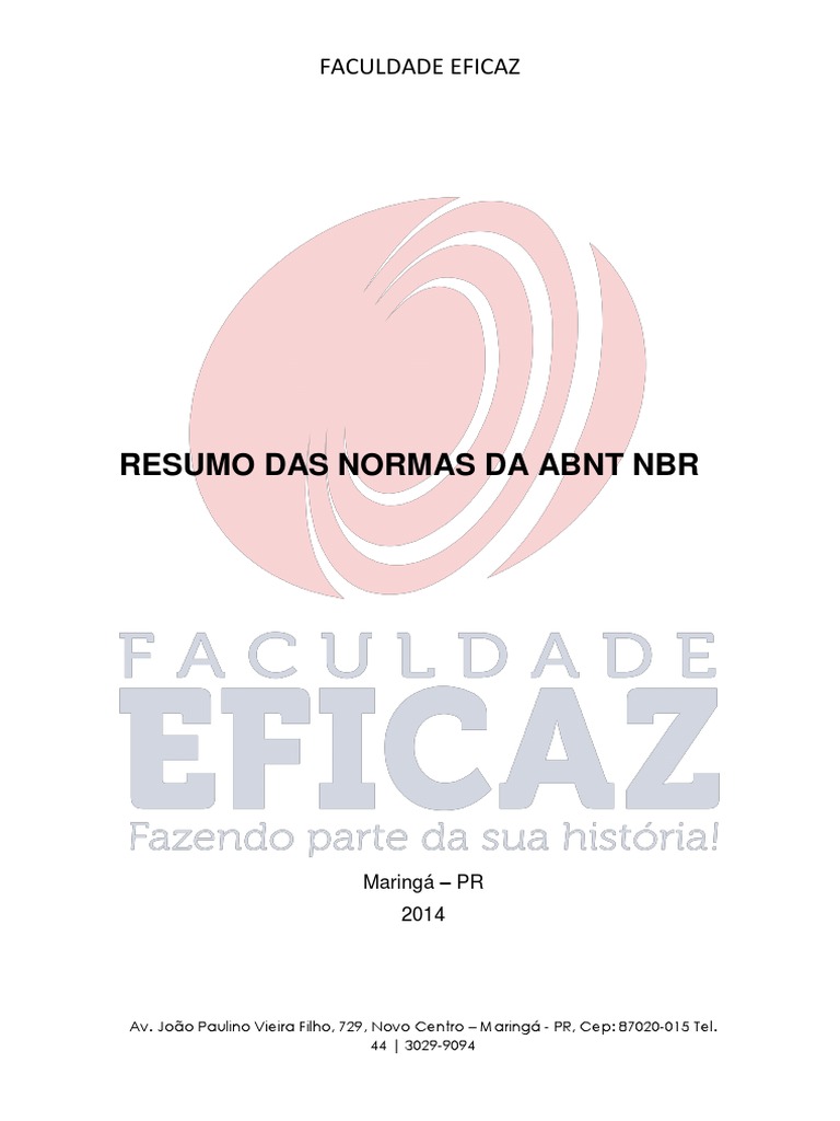 As Normas da ABNT NBR que estão em negrito serão as mais utilizadas pelos alunos na Faculdade Eficaz. André Luiz Silva de Jesus (2013), no texto: “Normas da ABNT para a Elaboração de Trabalhos Acadêmicos”, disponibilizou os links de todas as ABNTs mencionadas anteriormente. Para conferir e baixar essas Normas na íntegra acesse o site;