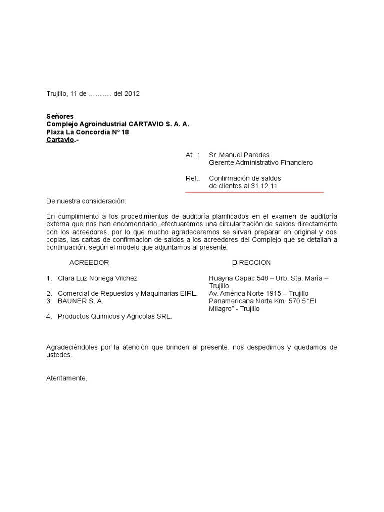 copias, las cartas de confirmacin de saldos a los acreedores del Complejo que se detallan a