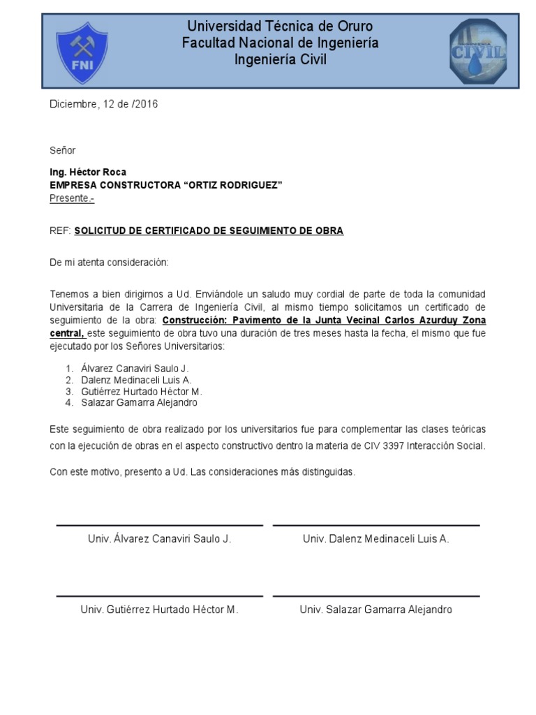 Universitaria de la Carrera de Ingeniera Civil, al mismo tiempo solicitamos un certificado de