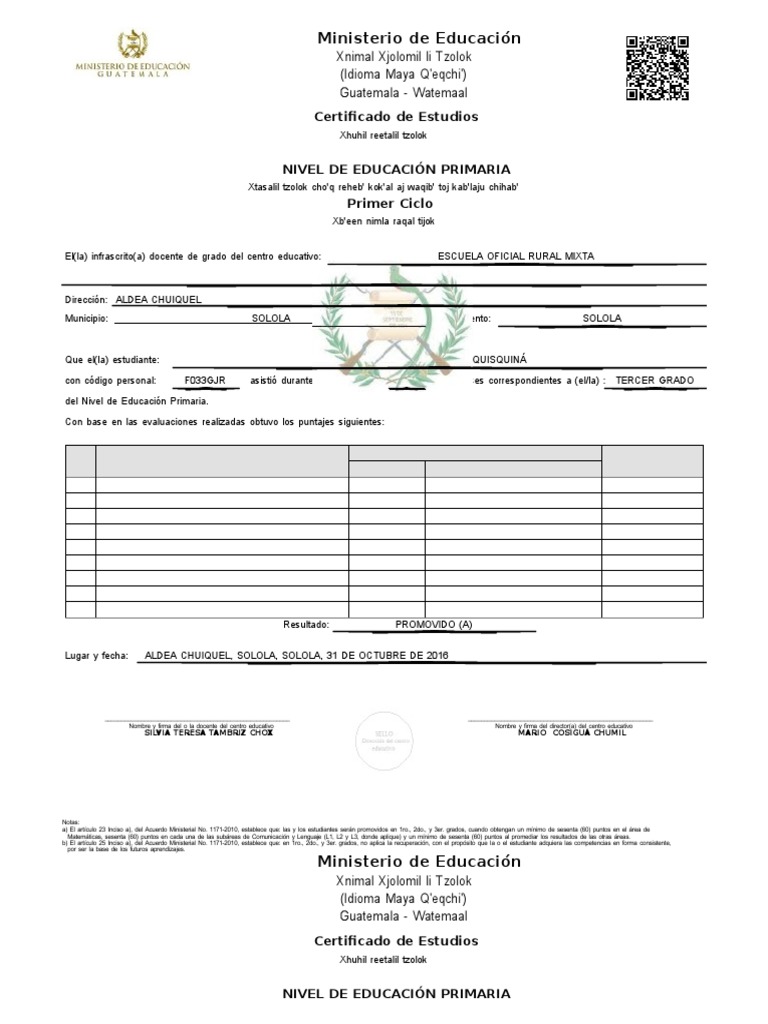a) El artculo 23 Inciso a), del Acuerdo Ministerial No. 1171-2010, establece que: las y los estudiantes sern promovidos en 1ro., 2do., y 3er. grados, cuando obtengan un mnimo de sesenta (60) puntos en el rea de
