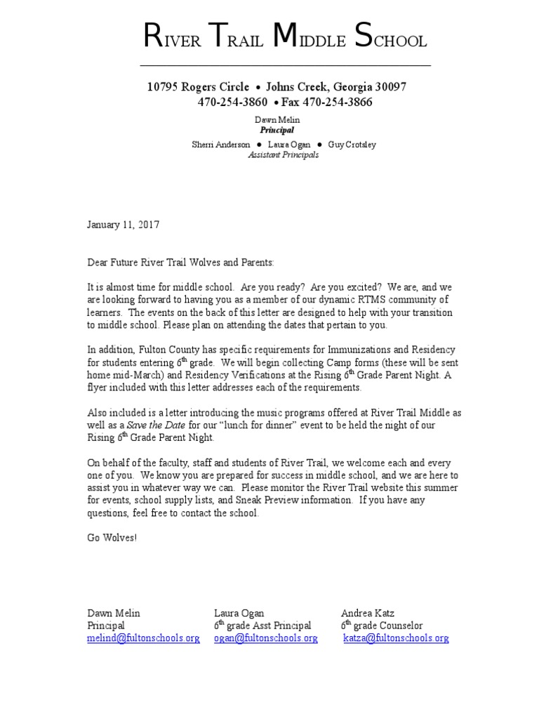 Dear Future River Trail Wolves and Parents: