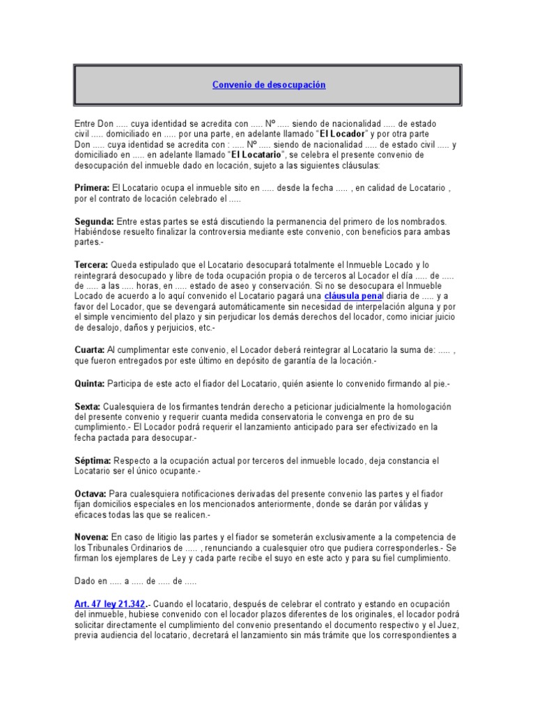 de desalojo, daos y perjuicios, etc.Cuarta: Al cumplimentar este convenio, el Locador deber reintegrar al Locatario la suma de: ..... ,