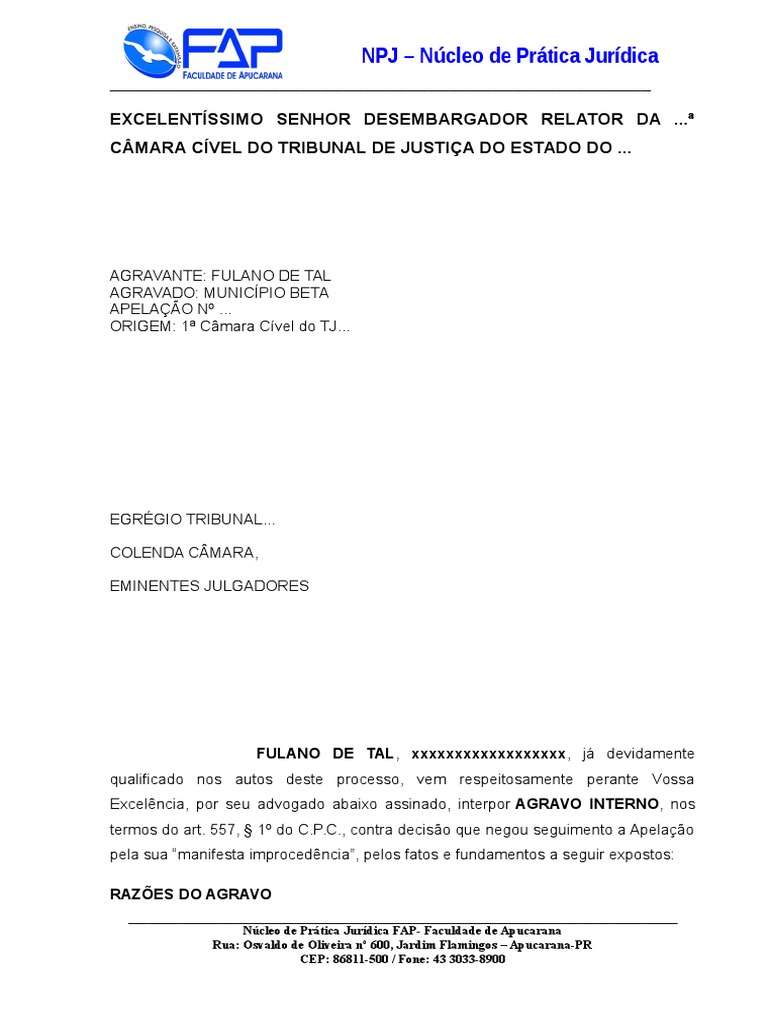 .... Colenda Turma.... decisão agravada foi publicada o dia .. 02.....TEMPERTIVIDADE DO RECURSO Trata-se de Agravo Regimental contra a bem redigida decisão monocrática do Desembargador Relator que........... confirmando-a ou reformando-a... 1 – DOS FATOS _____________________________________________________________________________________ Núcleo de Prática Jurídica FAP.... A r... o recurso foi protocolado no dia. 1 ....... a apresentação do feito em mesa para que a Corte Especial.. a Seção ou a Turma sobre ela se pronuncie.. O art. 03.....Faculdade de Apucarana Rua: Osvaldo de Oliveira nº 600......NPJ – Núcleo de Prática Jurídica ___________________________________________________ Douto Relator.. dentro do prazo estatuído pelo Regimento Interno.... CPC... às fls............ Jardim Flamingos – Apucarana-PR CEP: 86811-500 / Fone: 43 3033-8900 ... 231. iniciando-se o prazo no dia .. 01.... negou seguimento ao recurso de Apelação sob a alegação de improcedência do referido recurso e a consequente abertura de prazo nos termos do art.. 293 do Regimento Interno do TRF 1ª Região preceitua que a parte que se considerar prejudicada por decisão do relator poderá requerer dentro de cinco dias.. Desta forma...