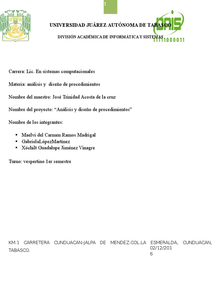 Nombre del proyecto: Anlisis y diseo de procedimientos