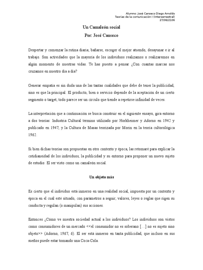 objeto>> (Adorno, 1967, 6). El ser est inmerso en tanta publicidad, que incluso en sus