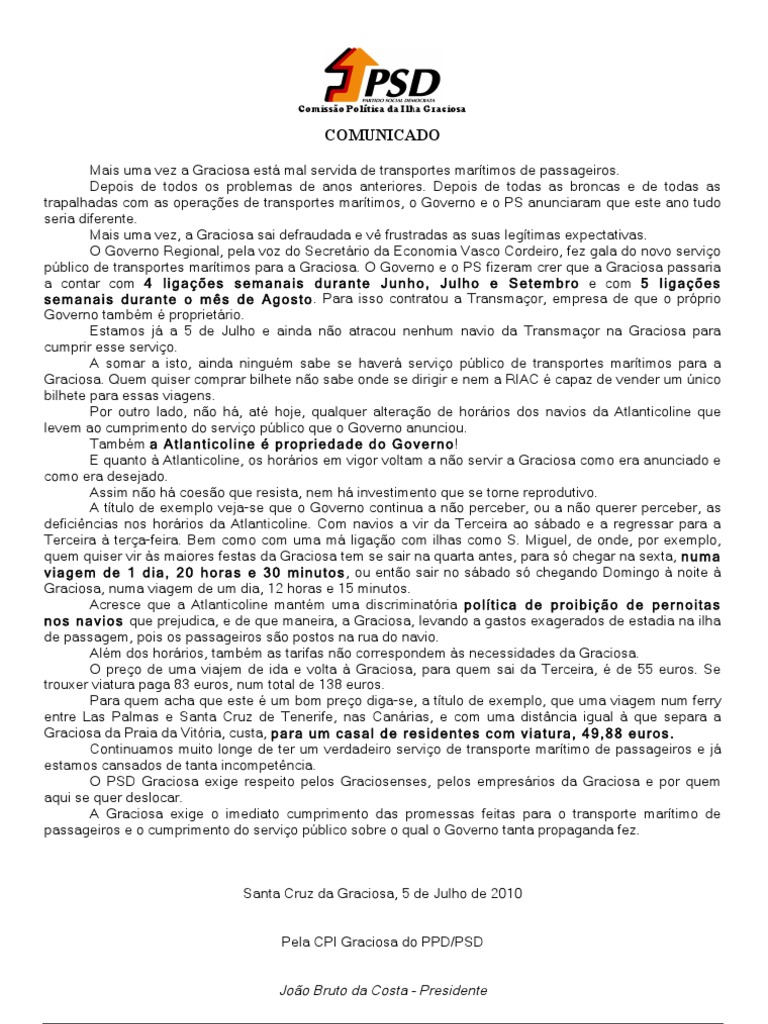 público de transportes marítimos para a Graciosa. O Governo e o PS fizeram crer que a Graciosa passaria