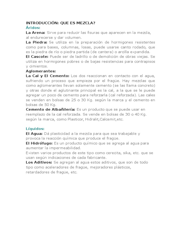 (*):El cemento de albailera no est en la tabla pero para mis calculo uso: 0.47 como el cemento