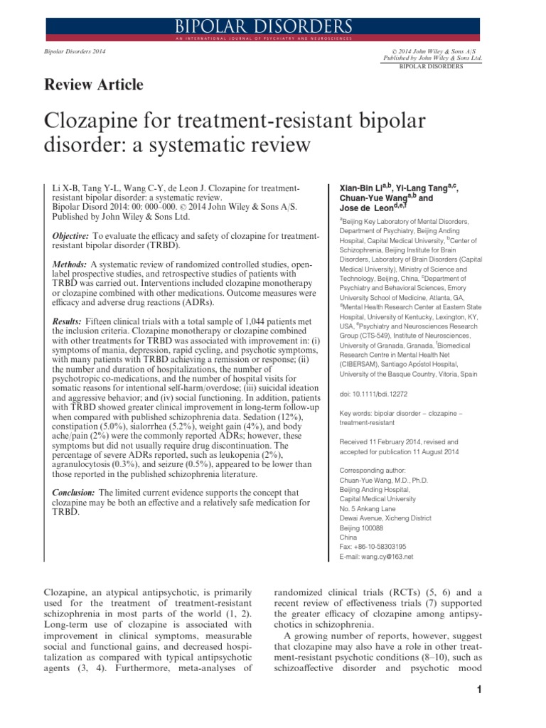Li X-B, Tang Y-L, Wang C-Y, de Leon J. Clozapine for treatment- Xian-Bin Lia,b, Yi-Lang Tanga,c,