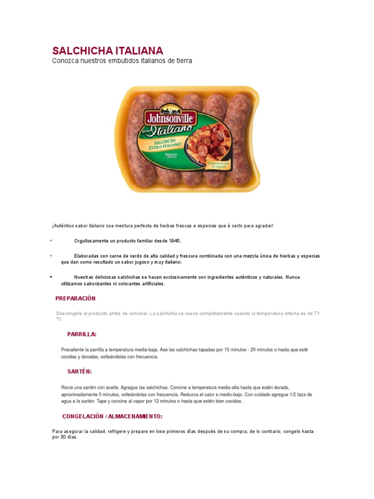 Descongele el producto antes de concinar. La salchicha se cuece completamente cuando la temperatura interna es de 71