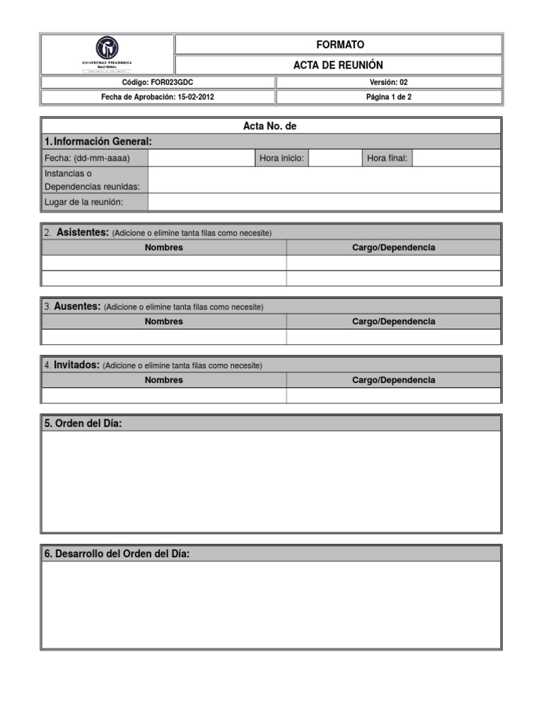 Acta No. de