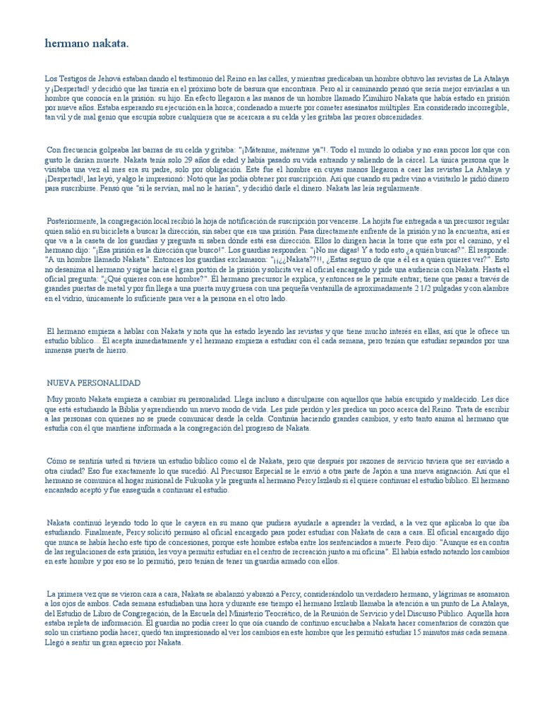 Nakata escriba cartas a la congregacin, expresando su aprecio por la hermandad, y rogaba a los hermanos que no dieran la verdad por