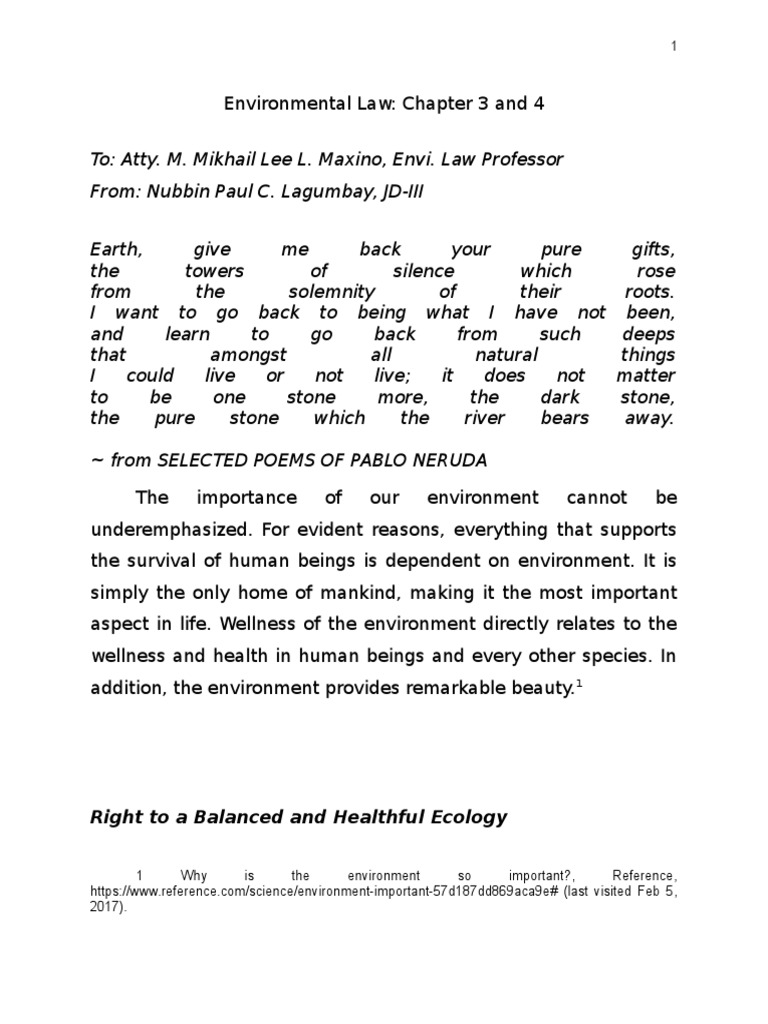 Environmentalist Atty. independent of specific legal rights. otherwise known as the Philippine Clean Air Act of 1999. thereby highlighting their continuing importance and imposing upon the state a solemn obligation to preserve the first and protect and advance the second. is a comprehensive air quality management 4 La Viña. but also for those to come — generations which stand to inherit nothing but parched earth incapable of sustaining life. First. crafting specific statutes and its rules and regulations Right to Clean Air Republic Act No. I would like to highlight 2 important views. . 3 rights to a balanced and healthful ecology and to health are mandated as state policies by the Constitution itself. p. Second. be imprudent on the part of environmentalists or communities to rely on this right alone as a basis for legal action. though such is a self-executory right. It would.M. La Viña observes that the constitutional right to a sound and healthful ecology is a self- executory and actionable right. the day would not be too far when all else would be lost not only for the present generation. such as. Antonio G. however. the right to balanced and healthy ecology is a constitutionally protected and mandated right. 8749. the state has the solemn obligation to have a proactive approach in protecting the environment. Right of Balanced Ecology. 137.4 Based on the foregoing.