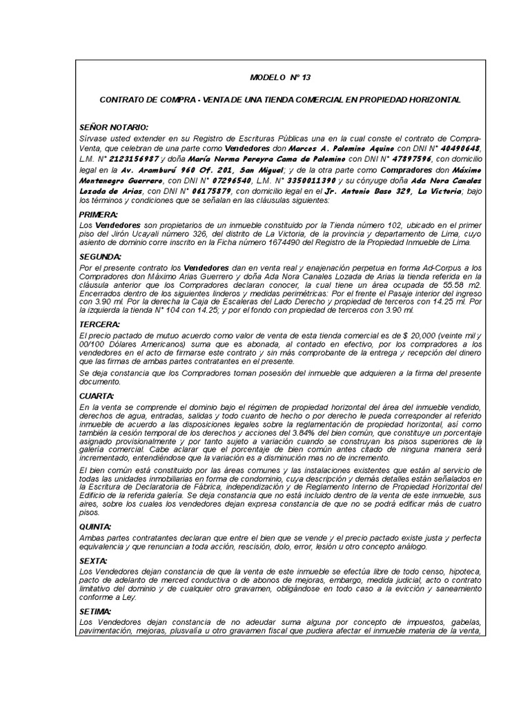 Venta, que celebran de una parte como Vendedores don Marcos A. Palomino Aquino con DNI N 40490648,