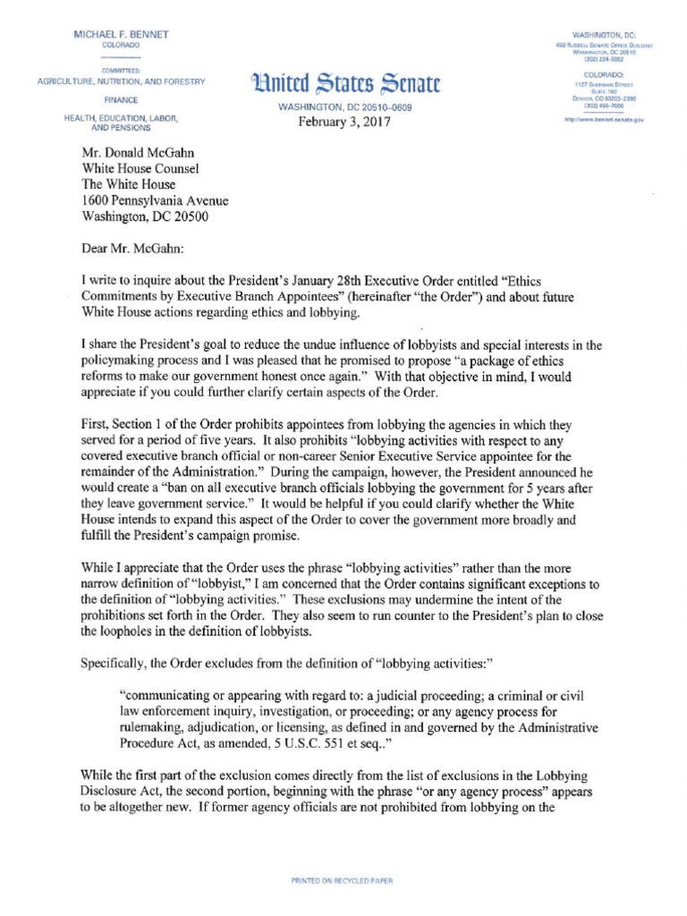 Bennet Letter to White House Counsel - Lobbying Ba...