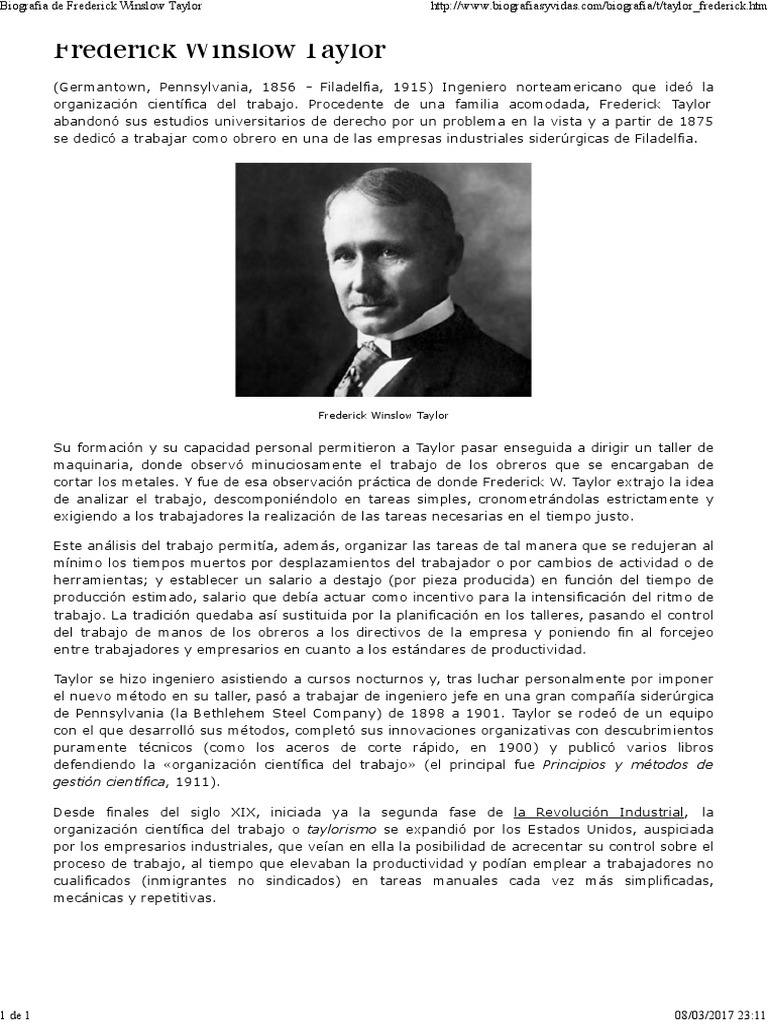 organizacin cientfica del trabajo. Procedente de una familia acomodada, Frederick Taylor