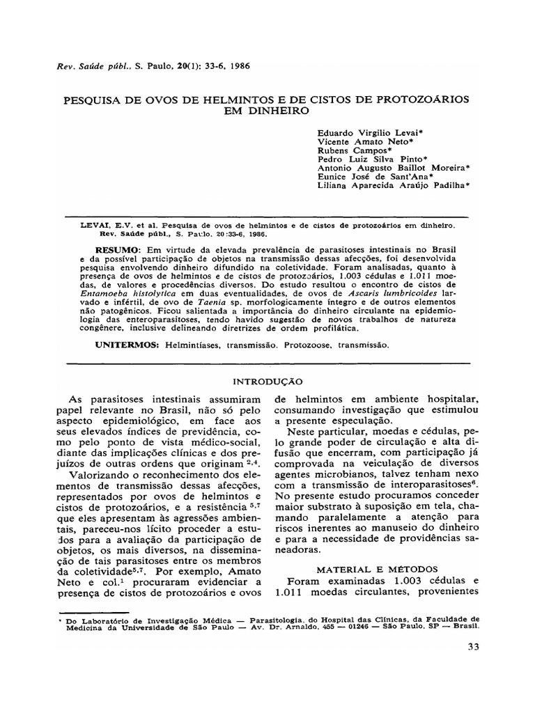 a missão de zelar pela saúde pública. nabara Koogan. Rev. 7. Amer. Saúde públ. A thousand and three banknotes and 1.P.3 de que cédulas e moedas eventualmente no qual é ressaltada a importância da contêm ovos de helmintos ou cistos de transmissão de parasitoses intestinais por protozoários.V. Rio de Ja.. MOTA. 1981. Medicina Tropical. os cistos de E. 6. parásitas em uma comunidade fechada. CAMILLO-COURA. Med. Brasil. para que o dinheiro preocupação básica. respaldam a suposição de meio de peças e objetos em banheiros. 23:401-19. P. bras. 5. II. 20:33-6. p. ABSTRACT: Due to the high prevalence of intestinal parasitic diseases in Brazil and to the fact that inanimate objects may play an important role in their transmission. Rev. Entamoeba histolytica cysts were found twice. 1982. Studies on the transmis- sion of amebiasis in a children's home 2. 1943. missão de enteroparasitoses. LEVAI. E.011 coins of different origins were analysed. gicos das enteroparasitoses no Estado In: Congresso da Sociedade Brasileira de de São Paulo. 8:87-91. como ser focalizado o perigo de aquisição5. infections. Aprovado para publicação em 21/10/1985.V. Aspectos epidemioló- de helmintos em ambientes hospitalares. trop. 3.B. Med. Rev. demonstrativas Trabalho com asserção semelhante. p. et al. . Infecções pelo papel-moeda. L.das advêm das presenças de formas de com implicações portanto diferentes. Protozoan. trop. 1970. Goiás. Caldas Novas. transmission. et al. Parasi- toses em uma comunidade fechada. tologia médica. Pesquisa de ovos 4. Caldas Novas.7. 2. 99:34-6. quando a sugerimos a execução de novas investiga- disseminação de doenças parasitárias é ções nesse campo. and fertile and infertile Ascaris lumbricoides eggs and one intact Taenia sp. paul. 11. 1982. 28 dez. Soc. 1981. a transmissão de enteroprotozoários. Med. S. 1982. [Tese de livre-docência — Faculdade de Medicina da UFRJ]. 1974. The importance of the handling of money in the epide- miology of common intestinal parasitic diseases is emphasized and it is suggested that further similar studies should be carried out. Contribuição ao in New Orleans. histolytica em moeda. REFERÊNCIAS BIBLIOGRÁFICAS 1.. possible means of prevention are also indicated. O Estado de São Paulo. neiro. S. G.P. J. Por isso.S. P. V. AMATO NETO. Paulo. subsidia lação podem carrear elementos de trans- nossa conclusão. mais ampla. CHIEFFI. Goiás.. W. estudo das geohelmintoses. PESSOA. transmission.a ed. A. et al. [Research into the transmission of helminthic eggs and protozoan cysts on money].. vale a pena lembrar e talvez outros veículos mereçam cogita- as opiniões não uniformes acerca do ções preventivas por parte dos que têm grau de resistência de cistos à dessecação. Gua- Mecanismos de transmissão de entero.°. 17. 23-4. 1986. yielding the follow- ing results. were also found. it was decided to carry out an investigation into the existence of helminthic eggs and protozoan cysts in money currently handled by the community. CHIEFFI. & MARTINS. Contribuição ao es. Recebido para publicação em 13/08/1985. IVANHOE. besides other nonpathogenic elements. No contexto deste assunto. egg. São Paulo. Resumos. et al. Nossas comprovações. UNITERMS: Helminthiasis.L. que outros objetos que circulam na popu- de uma comunidade fechada. tudo da história natural de enteroparasi.
