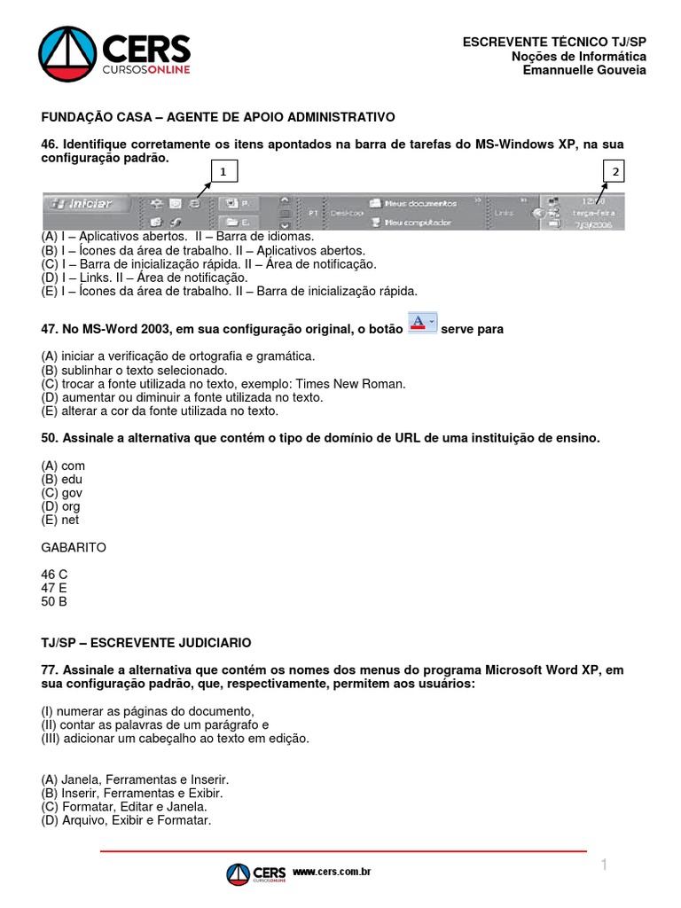 46. Identifique corretamente os itens apontados na barra de tarefas do MS-Windows XP, na sua