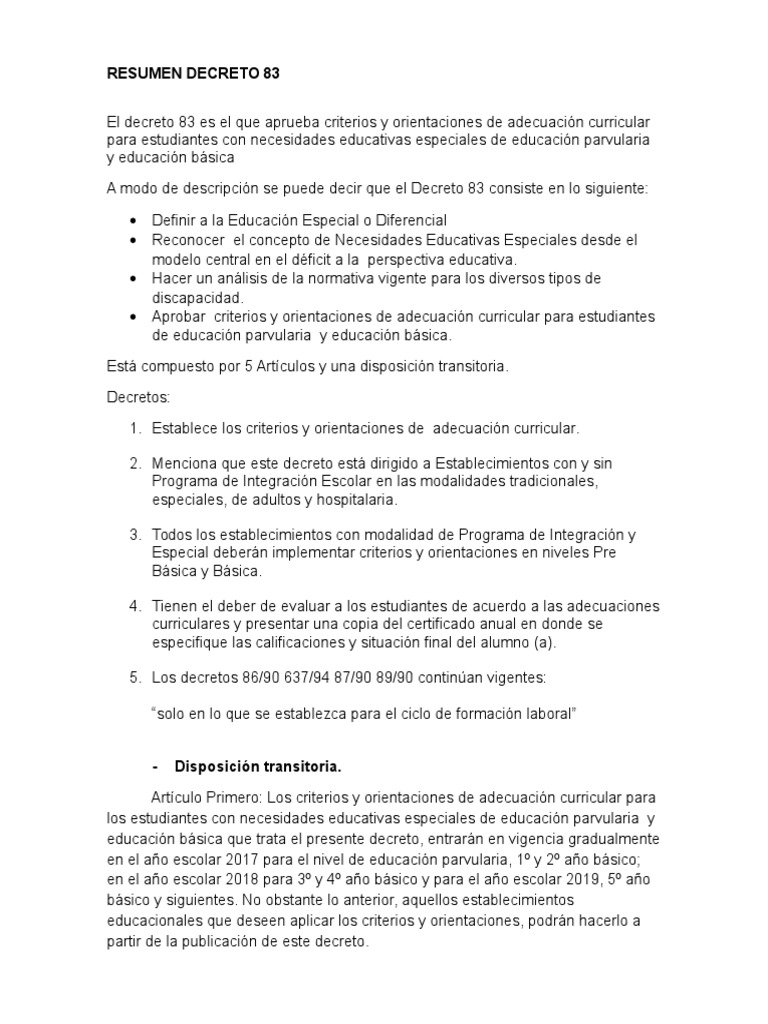 El decreto 83 es el que aprueba criterios y orientaciones de adecuacin curricular