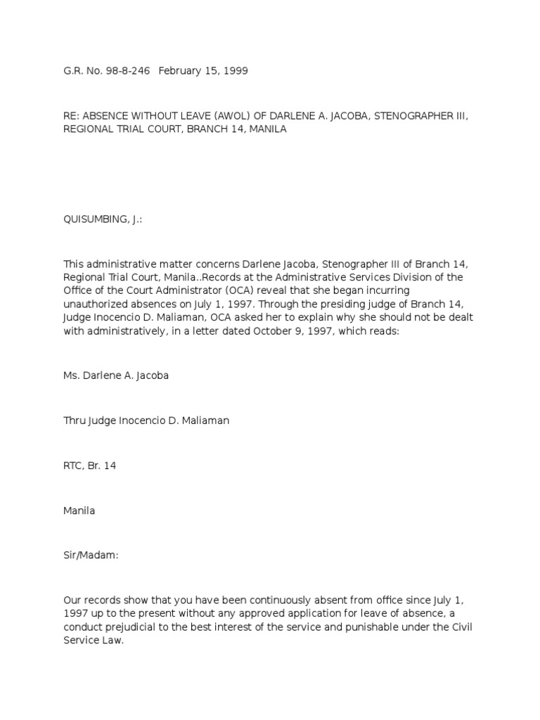 Officers and employees who are absent for at least thirty (30) days without approved leave are considered on Absence Without Leave (AWOL) and shall be dropped from the Service after due notice. Manila is hereby DROPPED from the service. . 7 This Court cannot countenance any act or omission on the part of all those involved in the administration of justice which would violate the norm of public accountability and diminish or even just tend to diminish the faith of the people in the Judiciary. Mendoza. Jr. Purisma.. Puno. 8 WHEREFORE. concur. Court Stenographer III. C.J. Regional Trial Court. 6 We have repeatedly held that the conduct and behavior of everyone connected with an office charged with the dispensation of justice is circumscribed with the heavy burden of responsibility. an employee who is absent without approved leave for at least 30 calendar days shall be separated from the service or dropped from the rolls even without prior notice. Panganiban. Buena and Gonzaga-Reyes.. SO ORDERED. Vitug. Melo. Branch 14. in view of the foregoing. Romero. . Davide. Pardo. Bellosillo. . Under the present Omnibus Rules on Appointments and Other Personnel Actions. JJ. . Darlene A Jacoba. Kapunan..