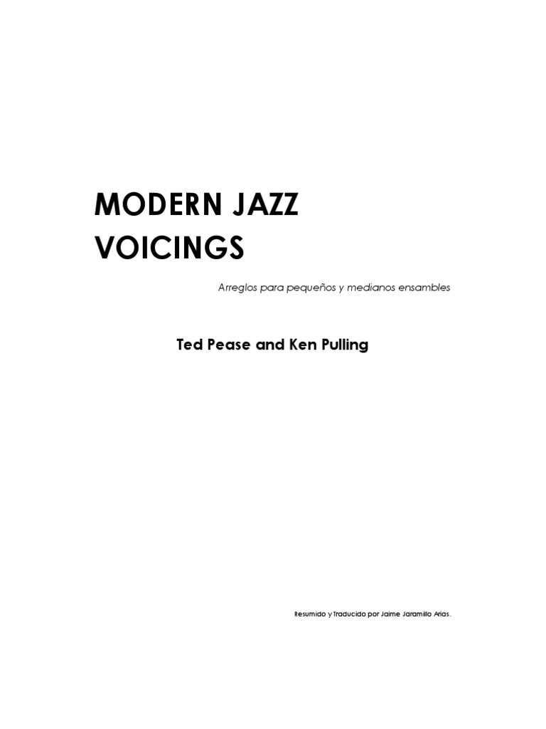 Este documento resume las técnicas de armonización y disposición de acordes para pequeños y medianos ensambles de jazz. Explica las tensiones disponibles en diferentes tipos de acordes, así como técnicas para rearmonizar notas de aproximación como la rearmonización cromática, dominante y diatónica. También cubre la escritura de bloques armónicos de 5 partes mediante la duplicación de la voz superior y combinaciones típicas de instrumentos.
