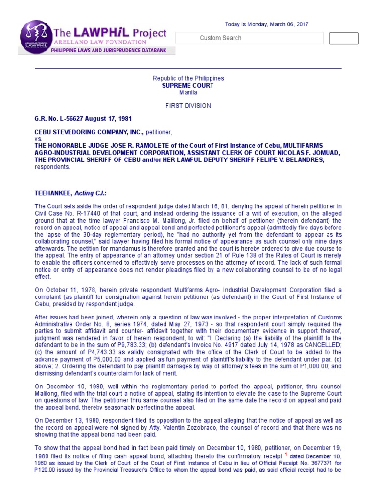 and every written notice. Ramolete. and may thereupon make such order as justice requires. Zozobrado. praying that respondent judge be ordered to immediately reinstate the appeal. and has conferred with. he shall only be entitled to one copy of any paper served upon him by the opposite side. the fact that no formal written entry of appearance has been filed by a new collaborating counsel or that the same was filed only after he had filed certain pleadings could not seriously affect. it is also presumed that the lawyer is authorized by. Jr. . et al. every pleading subsequent to the complaint. the name of the person who employed him. every written motion other than one which may be heard ex parte. appearance with the court.Every order required by its terms to be served. . would affect adversely the validity of the appeal timely perfected by such counsel. After a period of more than two months.. As urgently prayed for. Where an attorney appears for several parties. 1981. Valentin A. 2 Accordingly. (At most. Authority of attorney to appear. Papers to be filed and served. approve the record on appeal and thence forward the records of the case to this Court for review and for the payment of costs by private respondent. the mere circumstance that such acts were not done does not warrant the conclusion that the pleading filed by such counsel has no legal effect whatsoever. etc. on motion of either party and on reasonable grounds therefor being shown. herein petitioner filed an Opposition to the motion for execution contending. Malilong's authority to appear as collaborating counsel. that it had timely perfected its appeal on December 10. service upon him shall be made upon his attorneys or one of them. Atty.. While the context of the abovequoted provision of the Rules that the formal appearance of an attorney shall be filed with the court and served upon the parties affected thereby clearly indicate that the appearance of such an attorney shall be in writing. 1980. and to disclose whenever pertinent to any issue. On the same day. well within the prescribed period. the following provision of section 21 of Rule 138 reads: Section 21. much less nullify the validity of the acts and the pleadings filed by the appearing attorney as wrongly held by respondent judge..2.) It has thus been categorically ruled in Ong Ching vs. or on February 26. the same were of no force and effect since the lawyer who signed the same was not the attorney of record. 1981 by this Court. Section 2 of Rule 113 provides: SEC. and upon receipt of the required comment of respondents. ." On March 3. but the presiding judge may. respondent judge issued his challenged order denying the appeal and ordering the issuance of a writ of execution on the ground that "while indeed the notice of appeal and the record on appeal were filed on time and the appeal bond was also paid on time. the first counsel of record. in addition to his appearance through the pleadings filed by him. the judge could compel the attorney to file a formal written notice of appearance.. The question for determination is whether the lack of a formal written notice of appearance by the collaborating lawyer for herein petitioner. and no written power of attorney is required to authorize him to appear in court for his client.An attorney is presumed to be properly authorized to represent any cause in which he appears. his client regarding the case before he files an important responsive pleading for and on behalf of the latter. .retained by the Clerk of Court. 1981. It has been held that as a logical corollary of the presumption that a lawyer is authorized to appear for the party he represents. " As to Atty. as above stated. . before filing a pleading therein. If any of such parties has appeared by an attorney or attorneys. Malilong Jr. filed a formal notice of appearance as counsel for the defendant in collaboration with Atty. the Court declared the case submitted for decision. On March 16. 1981. require an attorney who assumes the right to appear in a case to produce or prove the authority under which he appears. respondent Multifarms filed a motion for execution alleging that judgment had already become final and executory on the alleged ground that "the defendant was not able to file a notice of appeal and record on appeal within the 30day reglementary period to perfect the appeal. or mention in said pleading that he is submitting the same in collaboration with the counsel of record. petitioner instituted this action of mandamus. " Failing in his motion for the reconsideration of said order. unless service upon the party himself is ordered by the court. the underlying reason for such requirement is that to enable the officers concerned to effectively serve processes on the attorney of record. lawyer Francisco Malilong. a temporary restraining order against enforcement of the challenged order was issued on April 14. and served upon the parties affected thereby. 3 that "while it may be desirable in the in interest of an orderly conduct of judicial proceedings that a counsel for a party should file with the court his formal written appearance in the case..