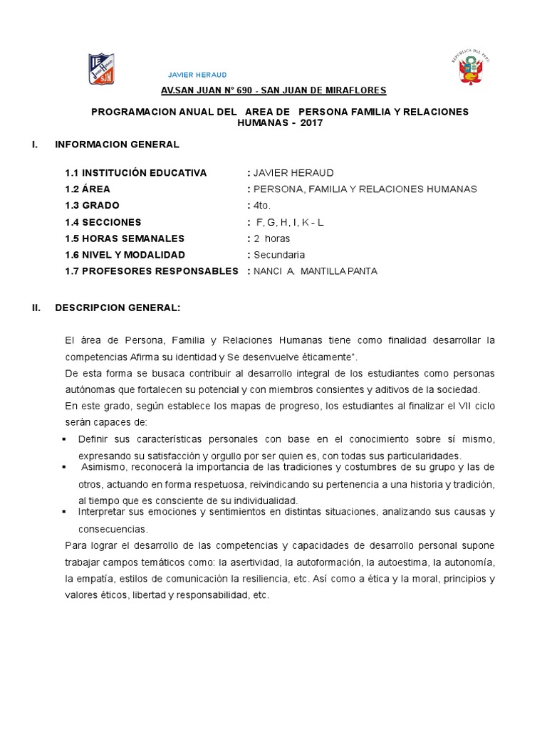 El rea de Persona, Familia y Relaciones Humanas tiene como finalidad desarrollar la