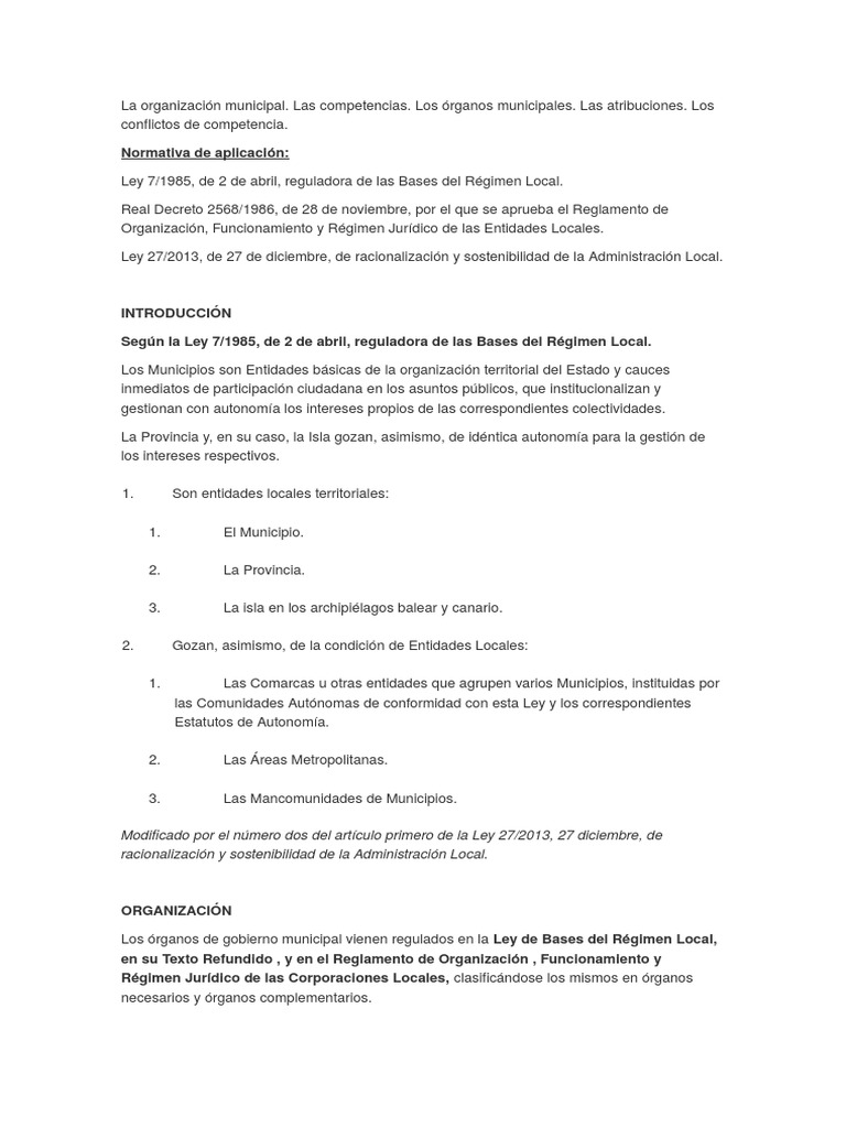 La organizacin municipal. Las competencias. Los rganos municipales. Las atribuciones.