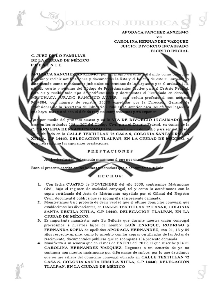 Que por medio del presente ocurso y en la VIA DE DIVORCIO INCAUSADO, con