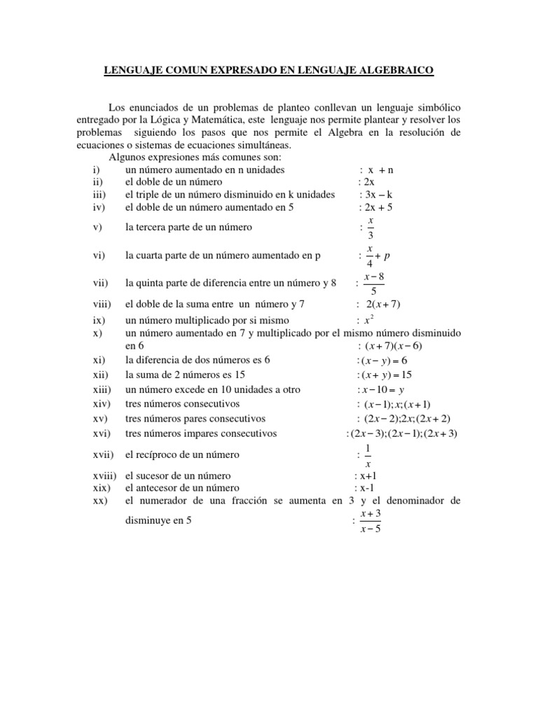 Este documento presenta 20 expresiones comunes de problemas matemáticos expresadas en lenguaje algebraico, incluyendo expresiones como el doble de un número, la tercera parte de un número, la suma de dos números, tres números consecutivos, y el recíproco de un número. El lenguaje algebraico nos permite plantear y resolver problemas siguiendo los pasos de la resolución de ecuaciones.